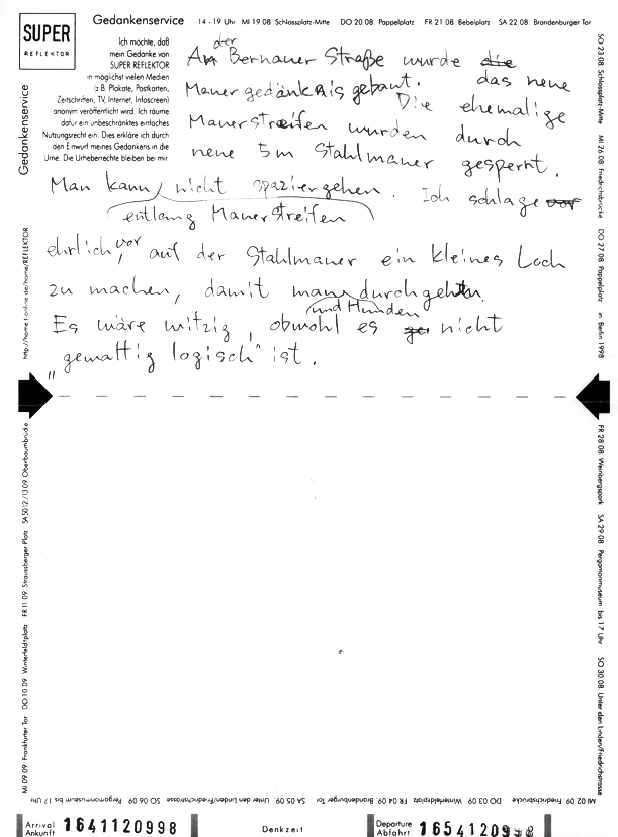 At the Bernauer Strasse the new memorial of the wall was built. The ancient wall line was closed by an new 5 meter iron wall. One can't go for a walk along the wall line. I propose sincerely to cut a little hole into the iron wall in order to make it possible to pass for men and dogs. It would be funny though it isn't "enormously logical".