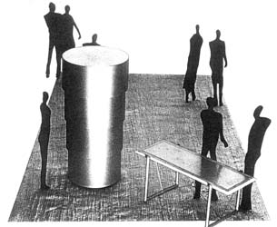's speziell entwickeltes Mobiliar: Die Gedankenstation aus Aluminium = Teleskopkabine, Falttisch, Klappstühle